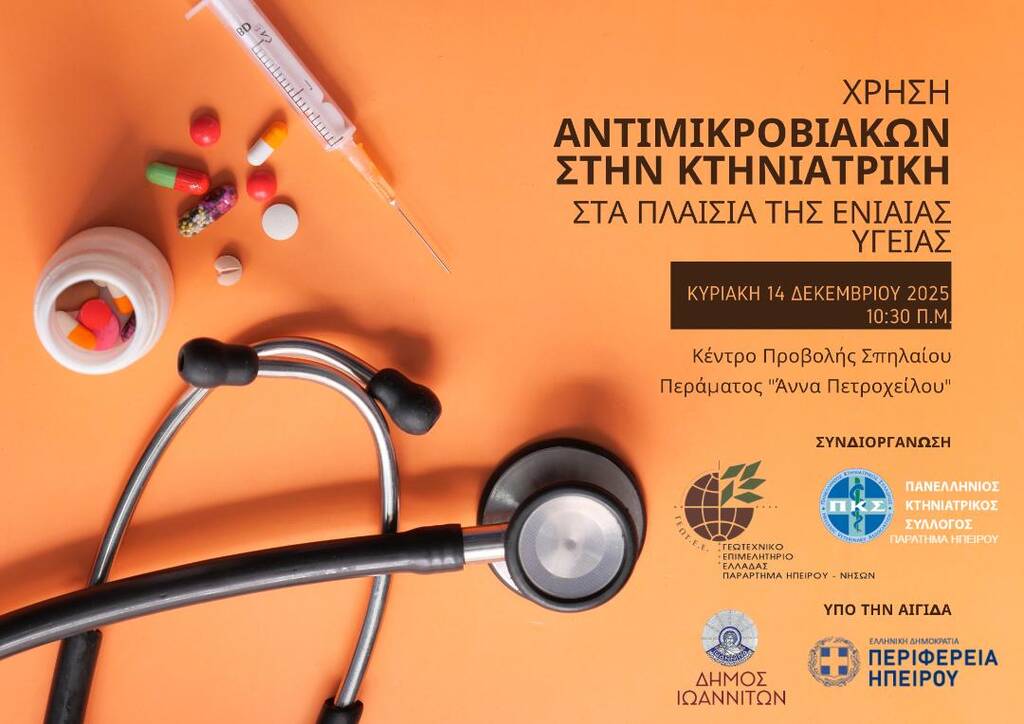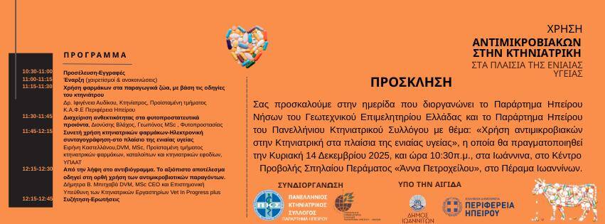 Γιάννενα - 14 Δεκεμβρίου: Εκδήλωση παραρτήματος Ηπείρου Π.Κ.Σ. και παραρτήματος Ηπείρου και νήσων ΓΕΩΤΕΕ "Χρήση αντιμικροβιακών στην κτηνιατρική στα πλαίσια της Ενιαίας Υγείας"