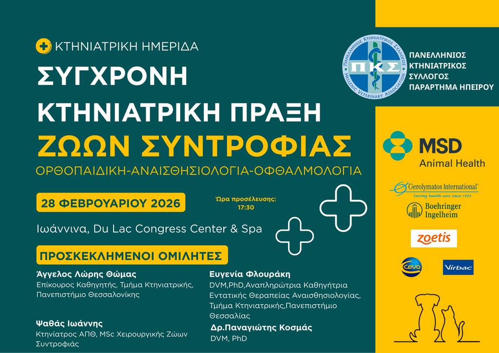 Η ημερίδα του Παραρτήματος Ηπείρου του Π.Κ.Σ. με θέμα «Σύγχρονη Κτηνιατρική Πράξη Ζώων Συντροφιάς-Ορθοπαιδική, Αναισθησιολογία,Οφθαλμολογία», θα πραγματοποιηθεί στα Ιωάννινα στις 28/2/2026.