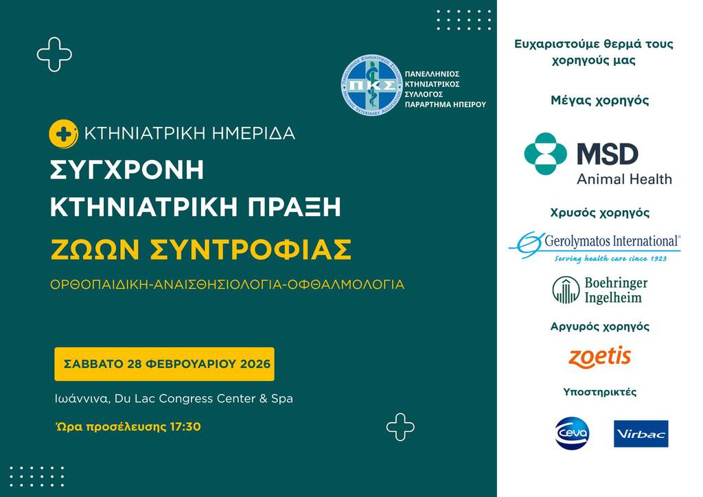 Η ημερίδα του Παραρτήματος Ηπείρου του Π.Κ.Σ. με θέμα «Σύγχρονη Κτηνιατρική Πράξη Ζώων Συντροφιάς-Ορθοπαιδική, Αναισθησιολογία,Οφθαλμολογία», θα πραγματοποιηθεί στα Ιωάννινα στις 28/2/2026.
