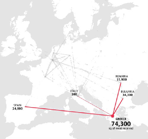 Στην Ελλάδα εισήχθηκαν 74.300 kg κρέας αλόγου που προερχόταν από Ισπανία (24.000 kg), Ιταλία (100 kg), Ρουμανία (15.900 kg) και Βουλγαρία (34.300 kg) όπως φαίνεται στον πίνακα 3. (http://www.guardian.co.uk/uk/datablog/interactive/2013/feb/15/europe-trade-horsemeat-map-interactive)