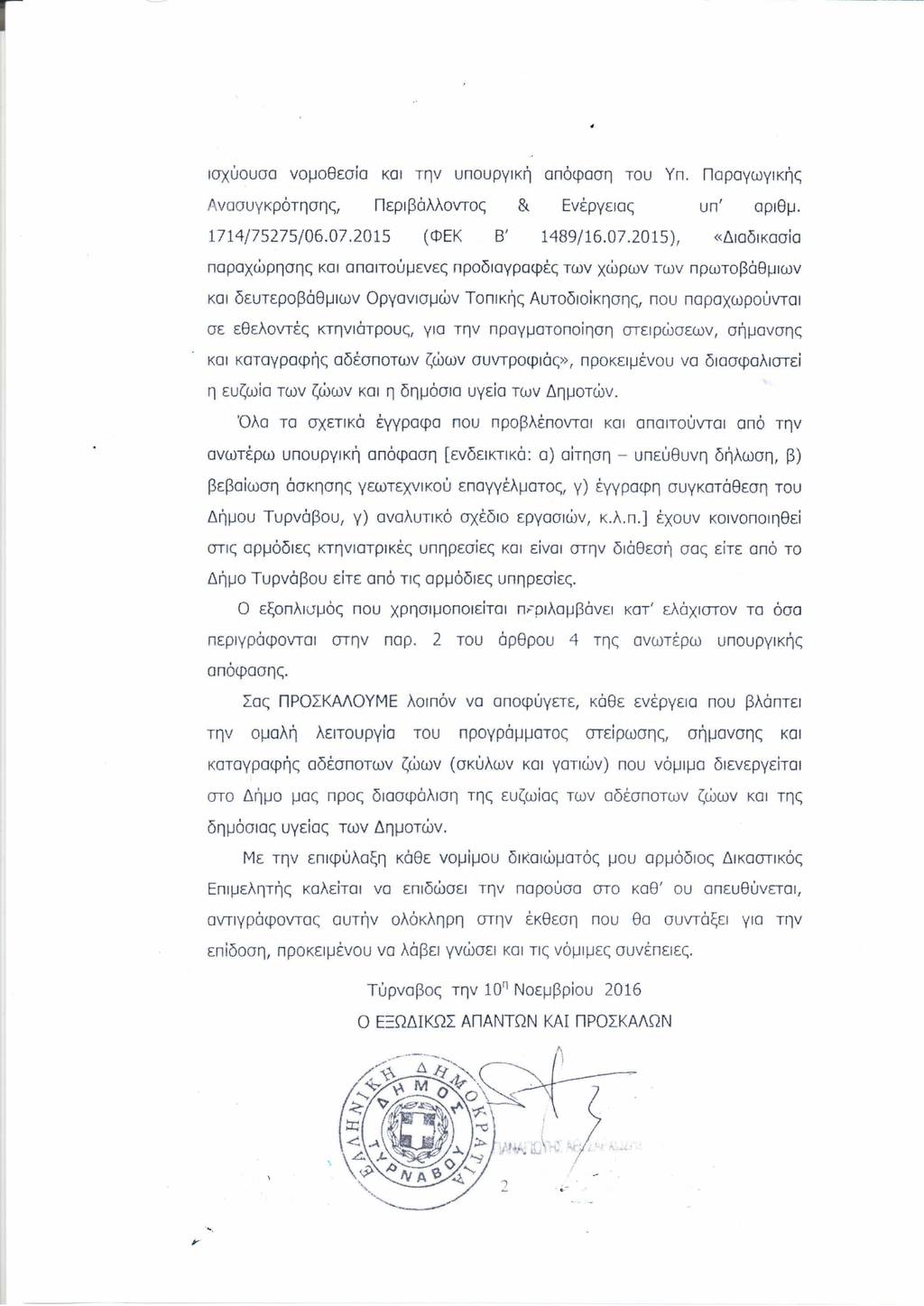 Εξώδικη Δήλωση του Δήμου Τυρνάβου προς τον Πανελλήνιο Κτηνιατρικό Σύλλογο
