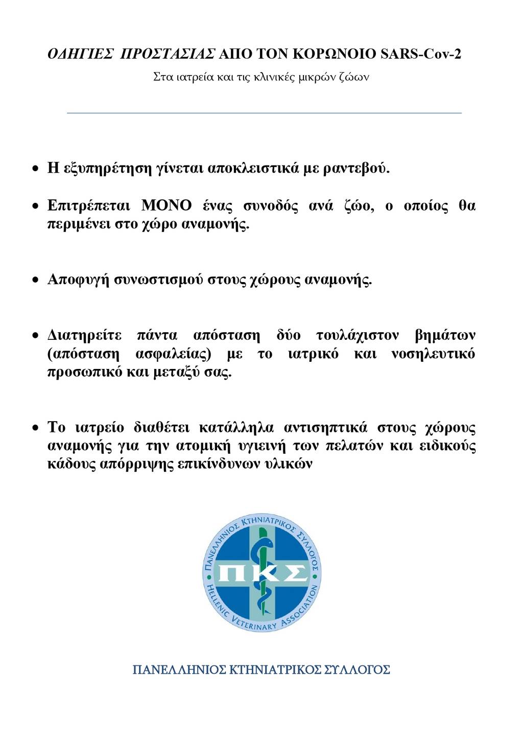 Συστάσεις του Πανελλήνιου Κτηνιατρικού Συλλόγου προς τους επισκέπτες κτηνιατρείων