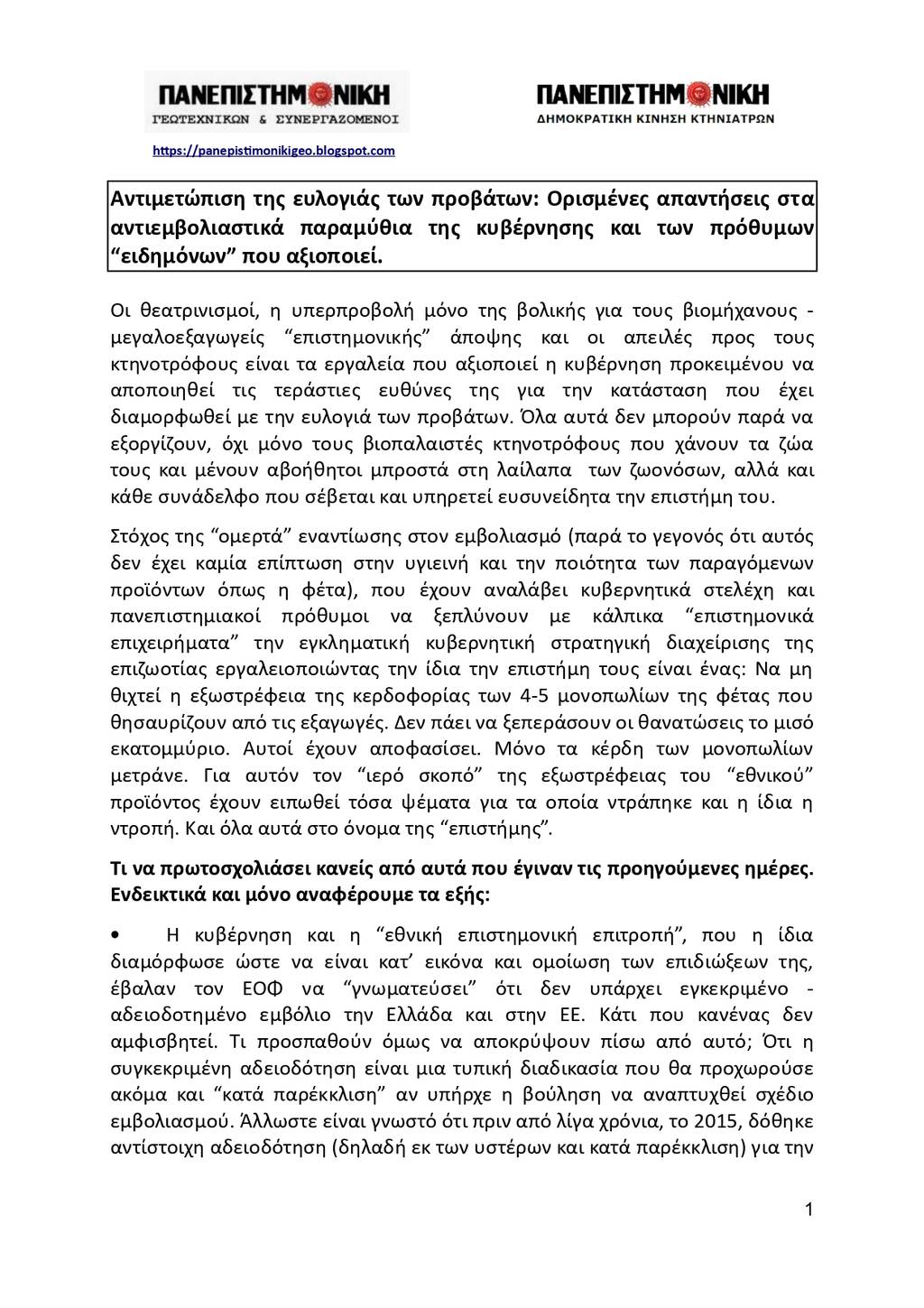 Ανακοίνωση της Πανεπιστημονικής Δημοκρατικής Κίνησης Κτηνιάτρων: Ευλογιά αιγοπροβάτων: Ορισμένες απαντήσεις στα "αντιεμβολιαστικά" παραμύθια της κυβέρνησης