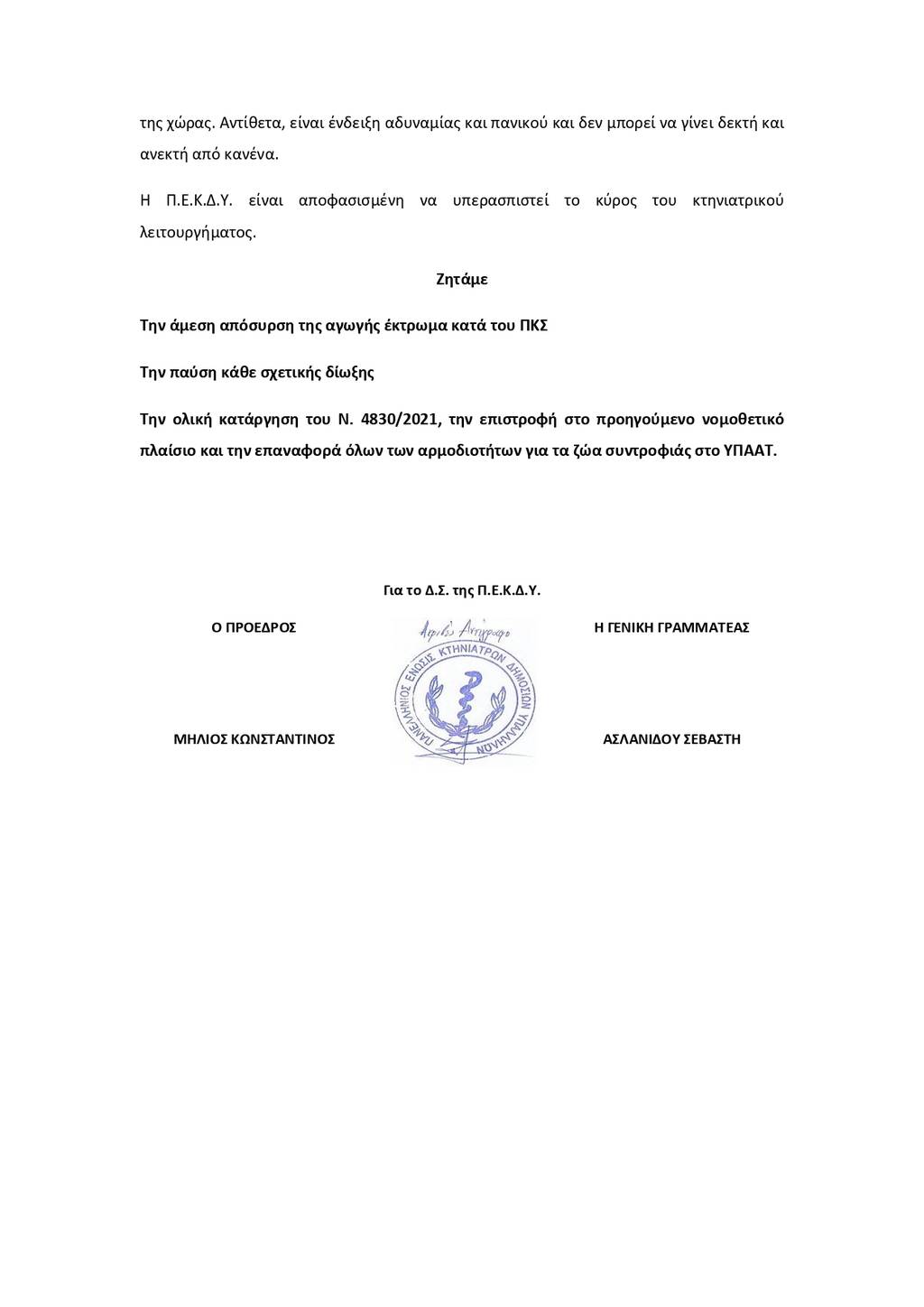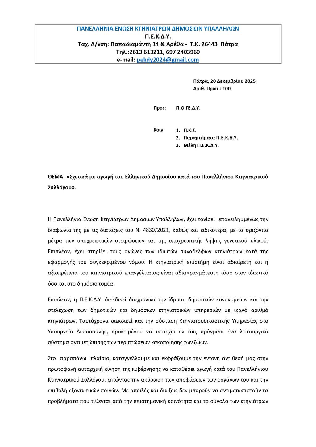 ΠΑΝΕΛΛΗΝΙΑ ΕΝΩΣΗ ΚΤΗΝΙΑΤΡΩΝ ΔΗΜΟΣΙΩΝ ΥΠΑΛΛΗΛΩΝ (Π.Ε.Κ.Δ.Υ.): Ανακοίνωση στήριξης του Π.Κ.Σ.