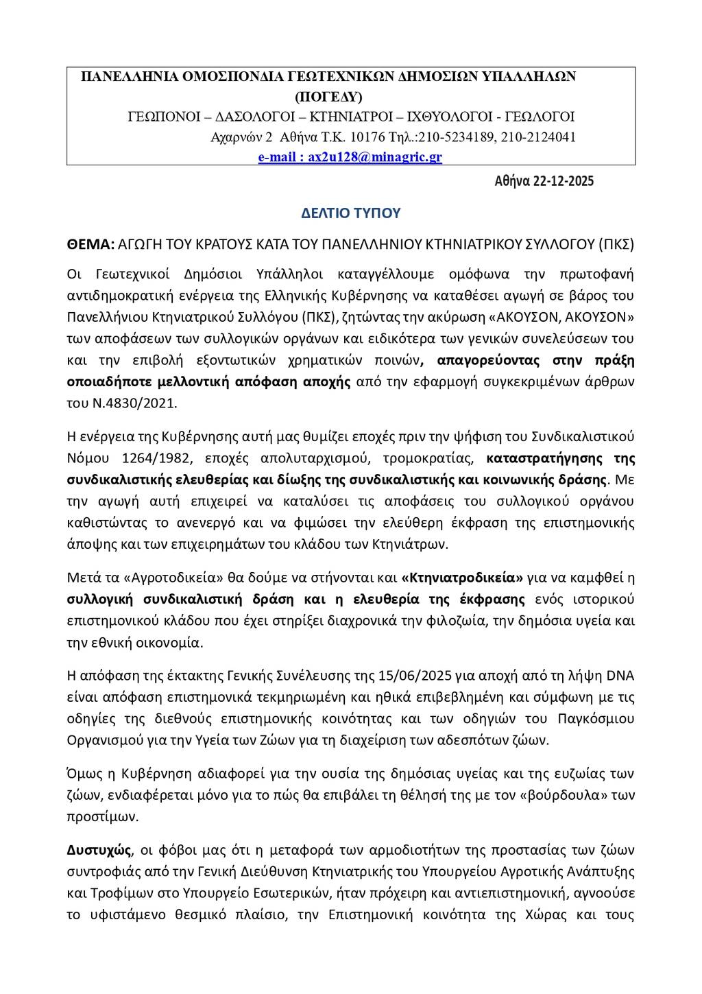 ΔΕΛΤΙΟ ΤΥΠΟΥ ΘΕΜΑ: ΑΓΩΓΗ ΤΟΥ ΚΡΑΤΟΥΣ ΚΑΤΑ ΤΟΥ ΠΑΝΕΛΛΗΝΙΟΥ ΚΤΗΝΙΑΤΡΙΚΟΥ ΣΥΛΛΟΓΟΥ Οι Γεωτεχνικοί Δημόσιοι Υπάλληλοι καταγγέλλουμε ομόφωνα την πρωτοφανή αντιδημοκρατική ενέργεια της Ελληνικής Κυβέρνησης να καταθέσει αγωγή σε βάρος του Πανελλήνιου Κτηνιατρικού Συλλόγου (ΠΚΣ), ζητώντας την ακύρωση «ΑΚΟΥΣΟΝ, ΑΚΟΥΣΟΝ» των αποφάσεων των συλλογικών οργάνων και ειδικότερα των γενικών συνελεύσεων του και την επιβολή εξοντωτικών χρηματικών ποινών, απαγορεύοντας στην πράξη οποιαδήποτε μελλοντική απόφαση αποχής από την εφαρμογή συγκεκριμένων άρθρων του Ν.4830/2021. Η ενέργεια της Κυβέρνησης αυτή μας θυμίζει εποχές πριν την ψήφιση του Συνδικαλιστικού Νόμου 1264/1982, εποχές απολυταρχισμού, τρομοκρατίας, καταστρατήγησης της συνδικαλιστικής ελευθερίας και δίωξης της συνδικαλιστικής και κοινωνικής δράσης. Με την αγωγή αυτή επιχειρεί να καταλύσει τις αποφάσεις του συλλογικού οργάνου καθιστώντας το ανενεργό και να φιμώσει την ελεύθερη έκφραση της επιστημονικής άποψης και των επιχειρημάτων του κλάδου των Κτηνιάτρων. Μετά τα «Αγροτοδικεία» θα δούμε να στήνονται και «Κτηνιατροδικεία» για να καμφθεί η συλλογική συνδικαλιστική δράση και η ελευθερία της έκφρασης ενός ιστορικού επιστημονικού κλάδου που έχει στηρίξει διαχρονικά την φιλοζωία, την δημόσια υγεία και την εθνική οικονομία. Η απόφαση της έκτακτης Γενικής Συνέλευσης της 15/06/2025 για αποχή από τη λήψη DNA είναι απόφαση επιστημονικά τεκμηριωμένη και ηθικά επιβεβλημένη και σύμφωνη με τις οδηγίες της διεθνούς επιστημονικής κοινότητας και των οδηγιών του Παγκόσμιου Οργανισμού για την Υγεία των Ζώων για τη διαχείριση των αδεσπότων ζώων. Όμως η Κυβέρνηση αδιαφορεί για την ουσία της δημόσιας υγείας και της ευζωίας των ζώων, ενδιαφέρεται μόνο για το πώς θα επιβάλει τη θέλησή της με τον «βούρδουλα» των προστίμων. Δυστυχώς, οι φόβοι μας ότι η μεταφορά των αρμοδιοτήτων της προστασίας των ζώων συντροφιάς από την Γενική Διεύθυνση Κτηνιατρικής του Υπουργείου Αγροτικής Ανάπτυξης και Τροφίμων στο Υπουργείο Εσωτερικών, ήταν πρόχειρη και αντιεπιστημονική, αγνοούσε το υφιστάμενο θεσμικό πλαίσιο, την Επιστημονική κοινότητα της Χώρας και τους ευρωπαϊκούς και διεθνείς θεσμούς, επιβεβαιώνονται με τον χειρότερο τρόπο για τον Κτηνιατρικό κόσμο και την Κτηνιατρική επιστήμη στη χώρα μας. Με Δελτίο Τύπου (Α.Π. 1422/25-02-2021), η Ομοσπονδία είχε προειδοποιήσει για τα προβλήματα που θα προέκυπταν, καθώς ήταν σαφές ότι κάθε επιστημονική τεκμηρίωση γίνεται αποδεκτή μόνο εάν συμφωνούν οι ΜΚΟ και ορισμένα φιλοζωικά σωματεία με συγκεκριμένη δράση. ΥΙΟΘΕΤΟΥΜΕ ΤΑ ΑΙΤΗΜΑΤΑ ΤΩΝ ΚΤΗΝΙΑΤΡΩΝ ΤΟΥ ΠΚΣ ΚΑΙ ΑΠΑΙΤΟΥΜΕ: •Την άμεση απόσυρση της αγωγής-ΑΠΕΙΛΗΣ κατά του ΠΚΣ. •Την παύση κάθε δίωξης κατά των μελών του Συλλόγου και κάθε αγωνιζόμενου κλάδου. •Την κατάργηση του ανεφάρμοστου και αναποτελεσματικού μέτρου του DNA, που αποτελεί εμπαιγμό για την επιστήμη και την κοινωνία, την ώρα που πολύτιμο γενετικό υλικό της παραδοσιακής αιγοπροβατοτροφίας χάνεται οριστικά λόγω έλλειψης τράπεζας γενετικού υλικού στα παραγωγικά ζώα.