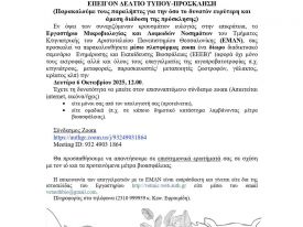 ΕΠΕΙΓΟΝ ΔΕΛΤΙΟ ΤΥΠΟΥ-ΠΡΟΣΚΛΗΣΗ: 6 Οκτωβρίου, Διαδικτυακό σεμινάριο Eνημέρωσης και Eκπαίδευσης Βιοσφάλειας